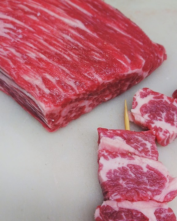 「牛肉串焼き」仕込んでいます❗肩ロース肉です。塩・胡椒をかけて、焼き上げます。