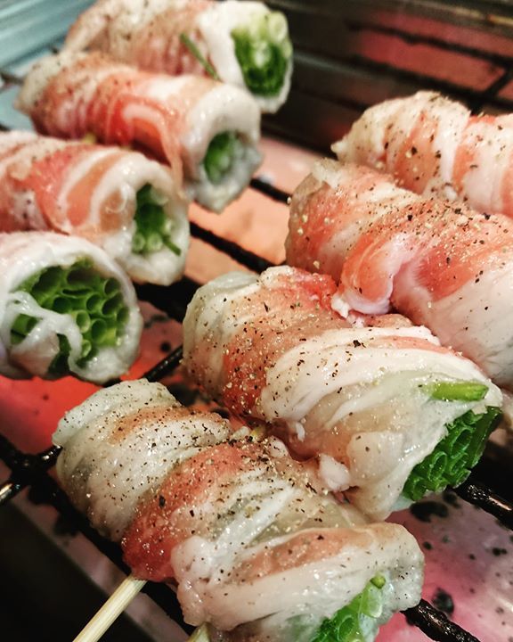 「肉巻きネギ串焼き」ご注文を頂きました(^-^)/❗他に「トマト肉巻き」「おくら肉巻き」が、あります。