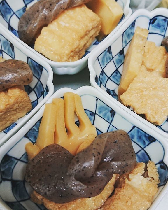 本日の「つけ出し」です(^-^)/❗厚揚げ・竹の子・こんにゃくの煮物です。