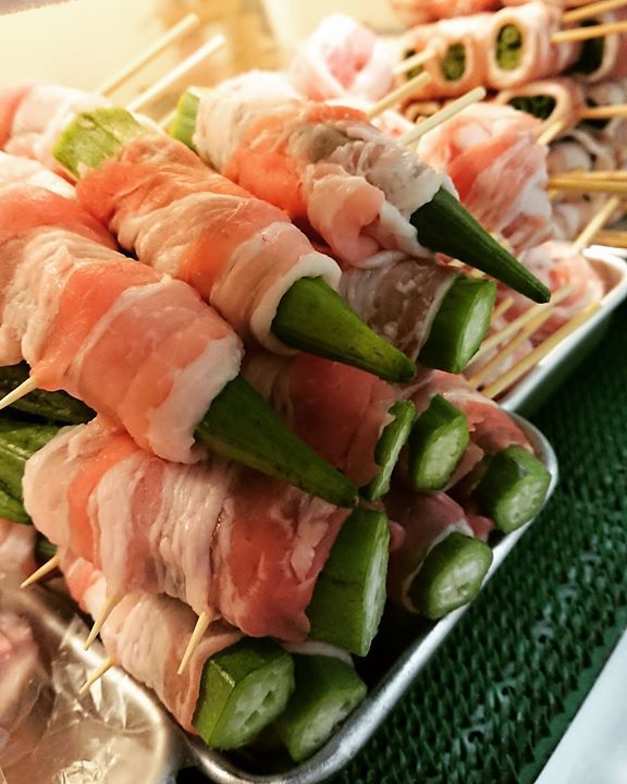 火曜日、休み明けです\(^^)/❗本日の肉巻き串ものは「トマト肉巻き」「おくら肉巻き」「小ネギ肉巻き」が、あります(^-^)/❗