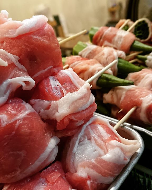 本日の肉巻き串ものは「トマト肉巻き」「おくら肉巻き」「小ネギ肉巻き」の三種類です(^-^)/❗