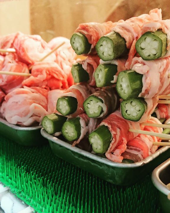 本日の肉巻き串ものは「トマト肉巻き」「芽キャベツ肉巻き」「おくら肉巻き」です(^-^)/❗
