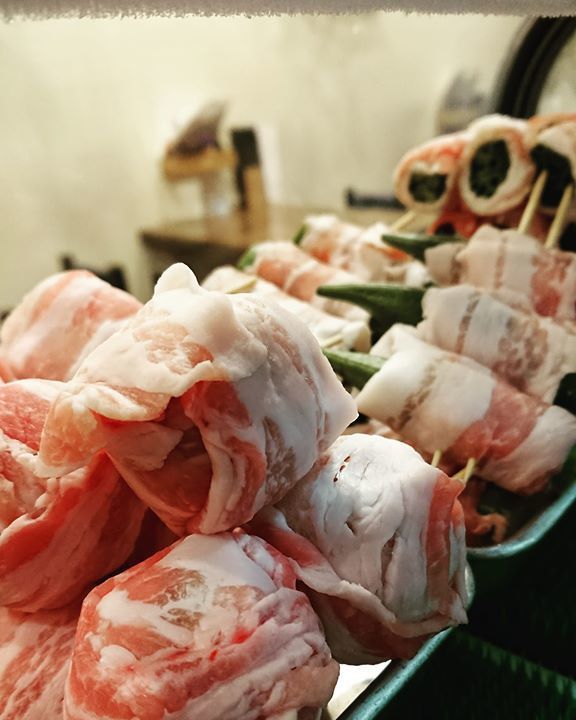 本日の肉巻き串ものは「トマト肉巻き」「おくら肉巻き」「小ネギ肉巻き」です(^-^)/❗