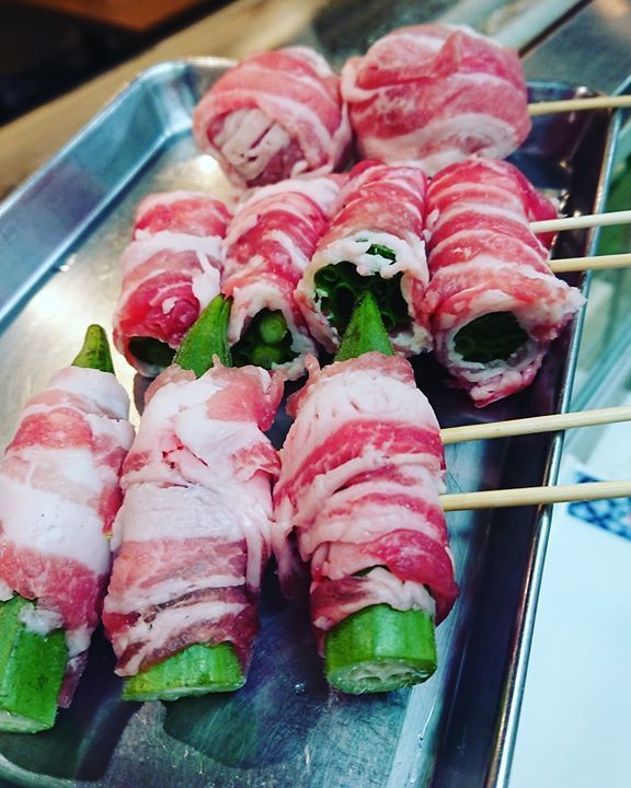 本日の肉巻き串ものは「トマト肉巻き」「おくら肉巻き」「小ネギ肉巻き」の、3種類です😄❗