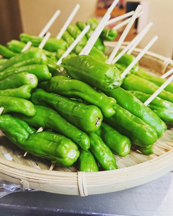 「ししとう串焼き」です😄❗1本150円(税別)です。その他の野菜焼きは「なす焼き」「にんにく焼き」「じゃがバター」が、あります😊
