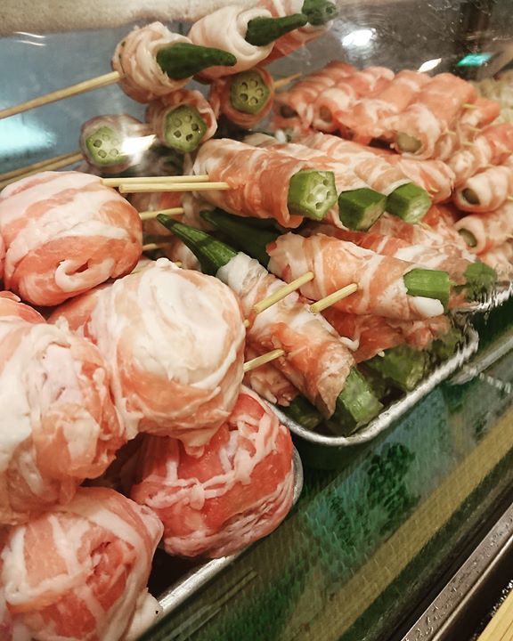 本日の肉巻き串ものは「トマト肉巻き290円」「アスパラ肉巻き270円」「おくら肉巻き270円」(税別)です😀❗