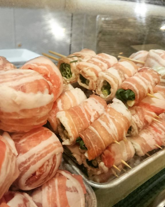本日の肉巻き串ものは「トマト肉巻き290円」「小ネギ肉巻き270円」「芽キャベツ肉巻き270円」です😀❗