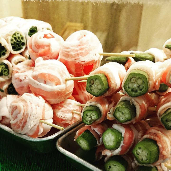 火曜日、休み明けです😀❗本日の肉巻き串ものは「おくら肉巻き270円」「トマト肉巻き290円」「小ネギ肉巻き270円」(税別)です☺️❗