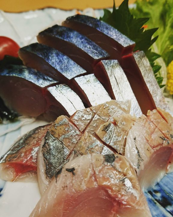「〆さばとあじ酢のお刺身」です😀❗一人前880円(税別)です。鯛は岩手県、鯵は長崎県の魚🐟です☺️❗