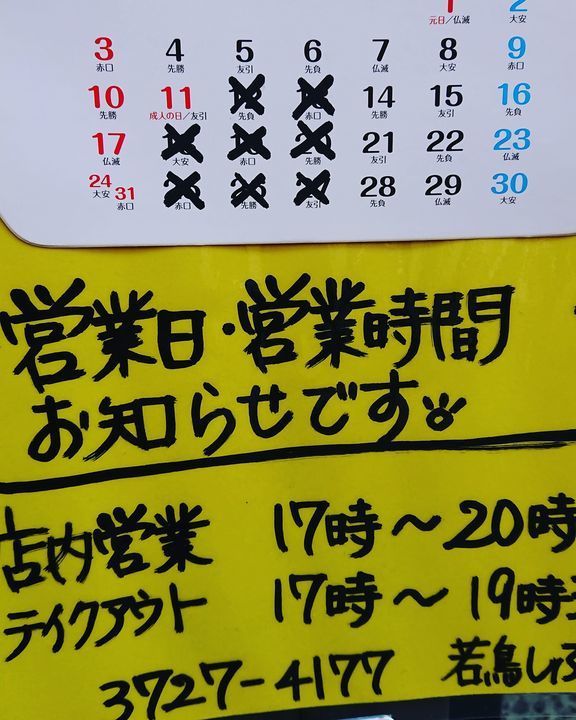 2月7日(日)迄、営業日は(月曜・火曜・水曜日)は、休ませて頂きます😔❗その他の曜日は営業時間をPM5時~PM8時迄(アルコールの提供はPM7時迄)と、させて頂きます😐❗また、変更がある場合も、あります。よろしくお願いいたします☺️❗