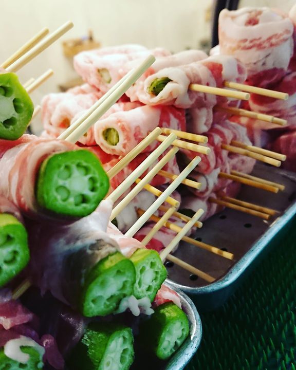 本日の肉巻き串ものは「おくら肉巻き300円」「アスパラ肉巻き300円」「トマト肉巻き330円」です😀❗