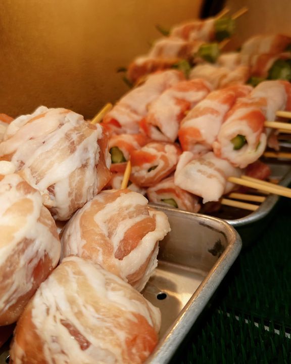 本日の肉巻き串物は『トマト肉巻き』『アスパラ肉巻き』『おくら肉巻き』です😀❗