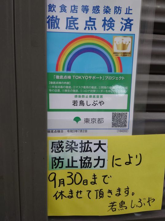 禁忌事項宣言延長(アルコールの提供無し)を受け9月30日迄、休ませて頂きます😓❗