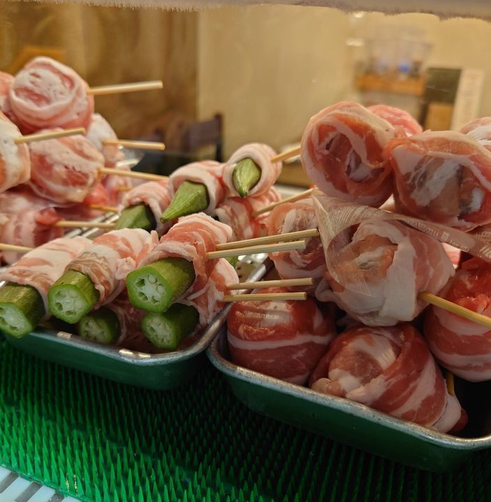 本日の肉巻き串ものは『トマト肉巻き』『おくら肉巻き』『芽キャベツ肉巻き』です😃❗明日11日火曜日は、お休みです😌❗