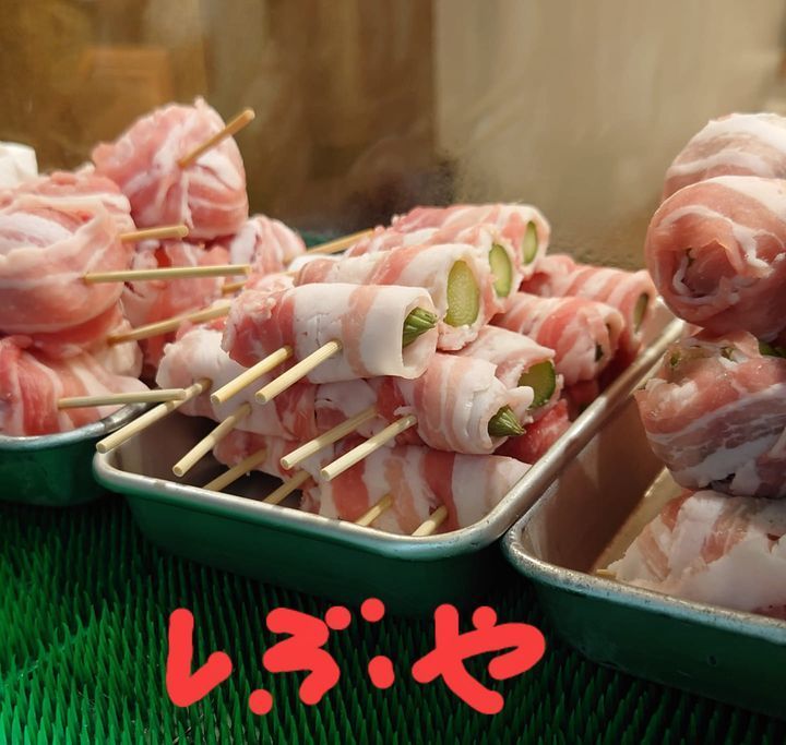 火曜日、休み明けです😄❗本日の肉巻き串ものは『トマト肉巻き』『アスパラ肉巻き』『芽きゃべつ肉巻き』です😋❗