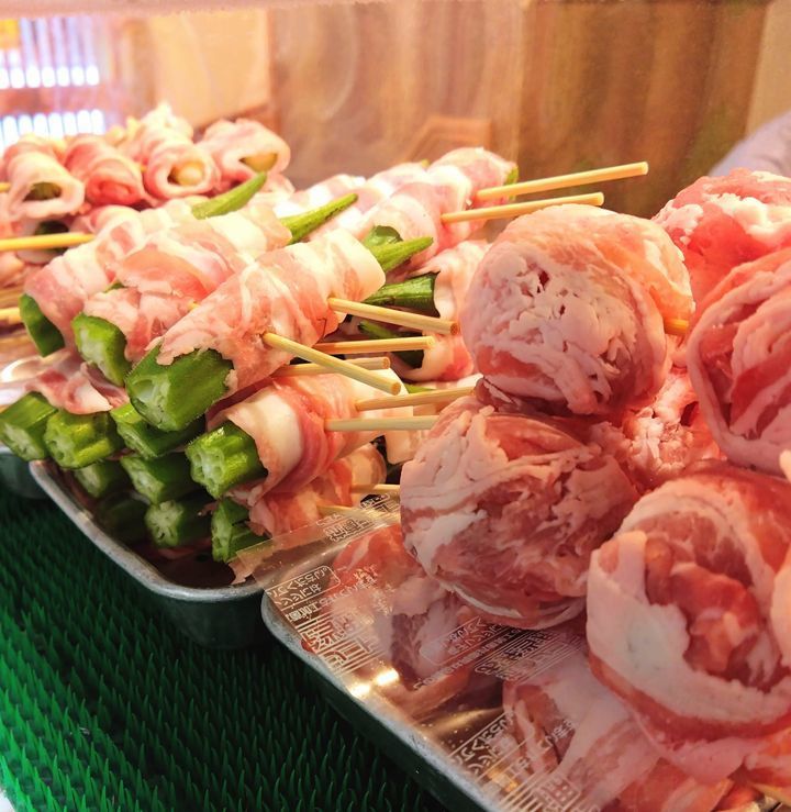 本日の肉巻き串焼きは『トマト肉巻き』『おくら肉巻き』『アスパラ肉巻き』です😃❗